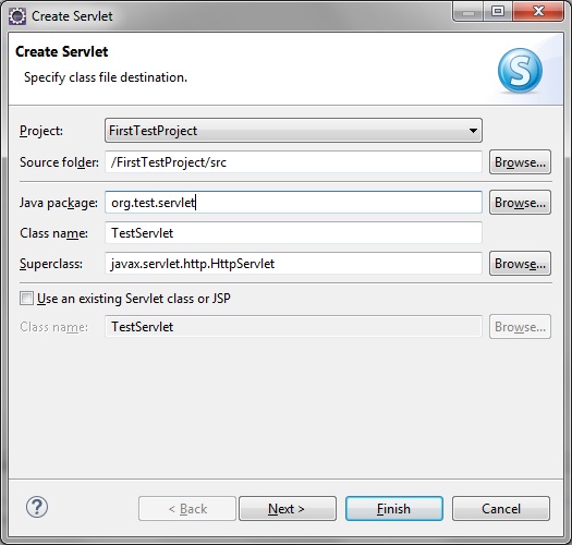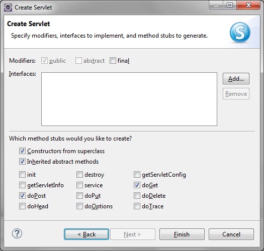 és elindítjuk az tomcat-et, akkor máris látni fogjuk a kezdő oldalunkat. http://localhost:8080/FirstTestProjectAkkor készítsünk most servlet-et. A servlet HTTP kéréseket dolgoz fel(request) és HTTP kimenetet ad vissza (response). A src mappán jobb klikk new->servlet menüpontot válasszuk és tölsük ki így a következő ablakot: ![]() A második fülön pl megváltoztathatjuk az elérési utat: ![]() Az utolsó ablakon kiválaszthatjuk hogy milyen metódusokat generáljon le nekünk alapból: ![]() A létrejött TestServlet.Java fájlunk tartalma így néz ki: