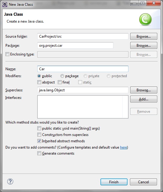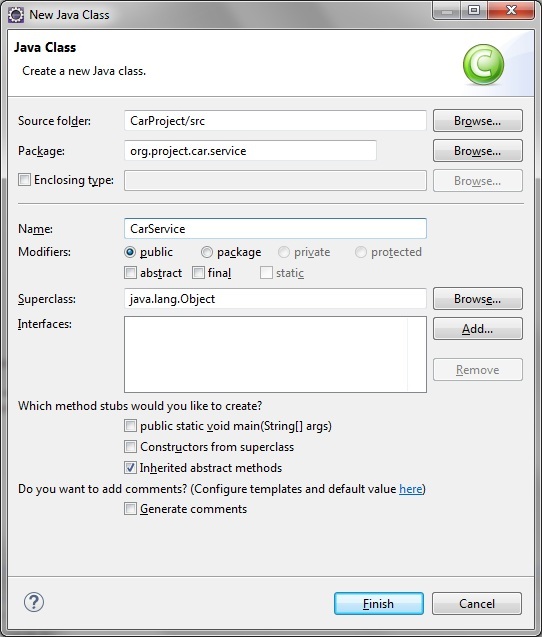 | Készítsünk egy új dynamic web projecktet CarProject néven. Készítsük el elsőnek a model réteget. Egy sima POJO-t(sima java osztály) fogunk csinálni: ![]() A fájl tartalma nézzen ki így: